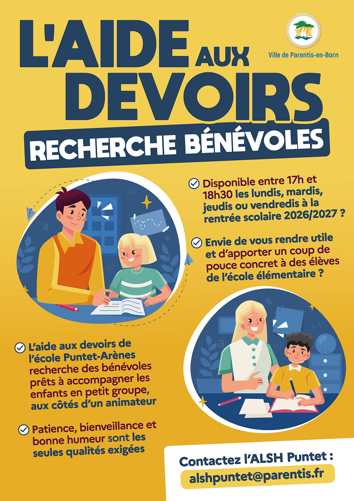 La Ville de Parentis-en-Born lance un appel à bénévoles pour la mise en place du dispositif d’aide aux devoirs proposé au sein de l’école élémentaire Puntet-Arènes, à la rentrée scolaire 2026/2027.