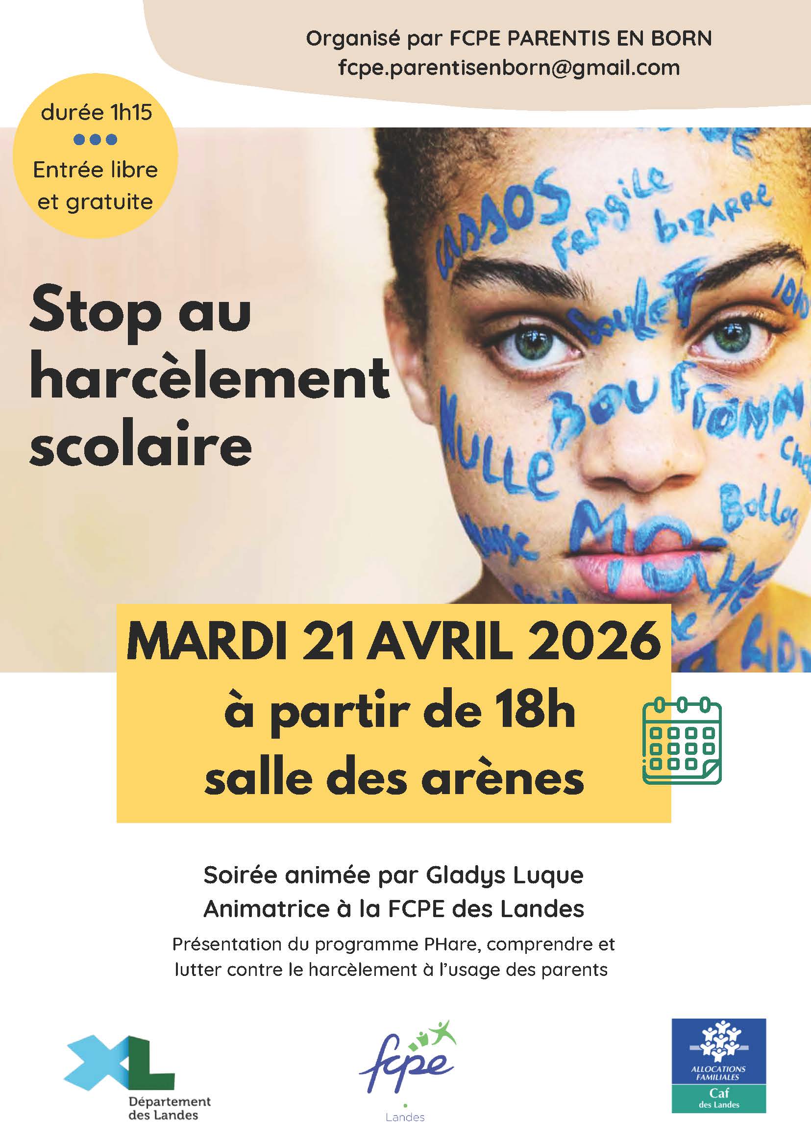 La FCPE de Parentis-en-Born propose une conférence consacrée au harcèlement scolaire, mardi 21 avril 2026 à partir de 18h, à la salle des Arènes.